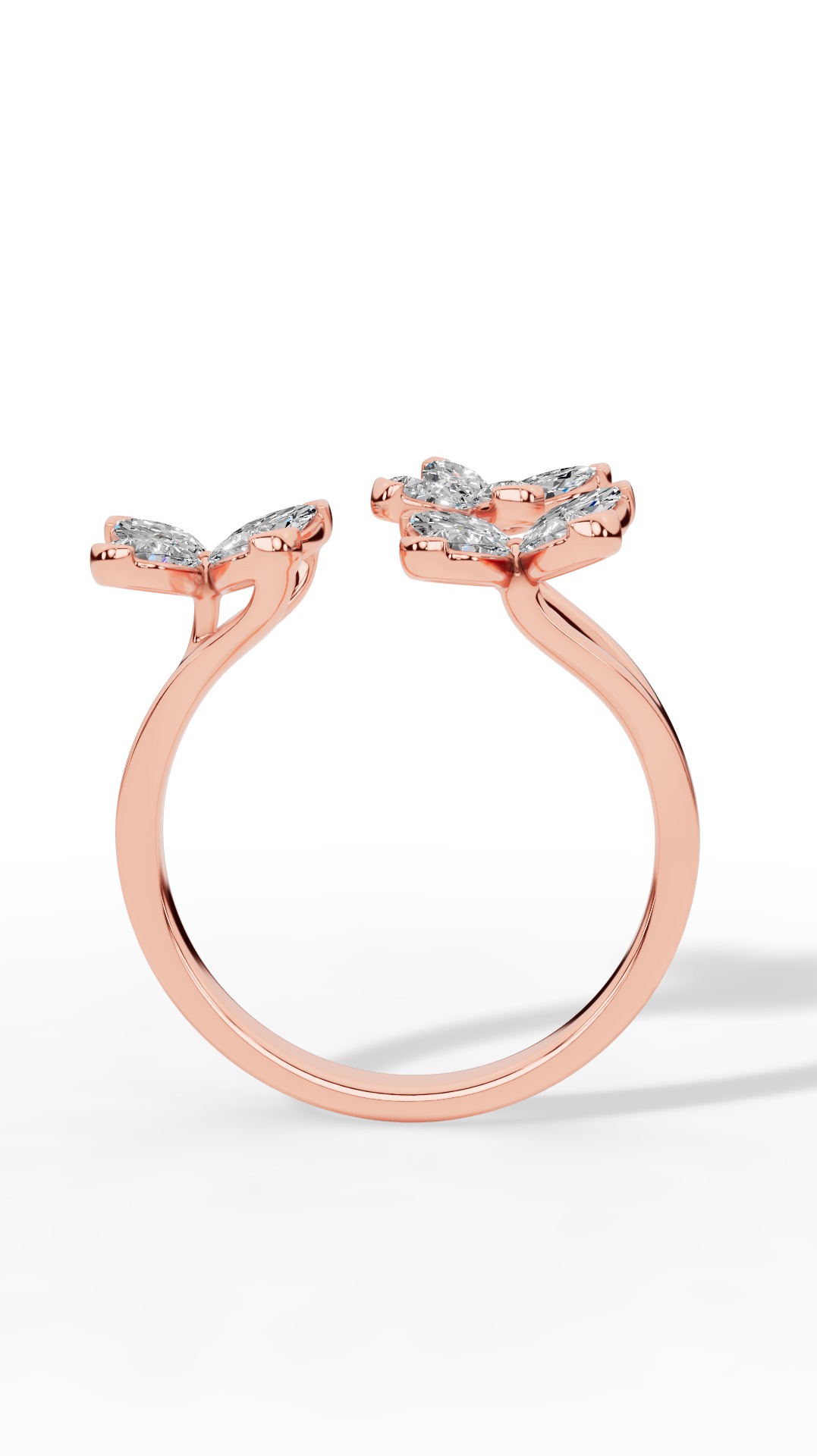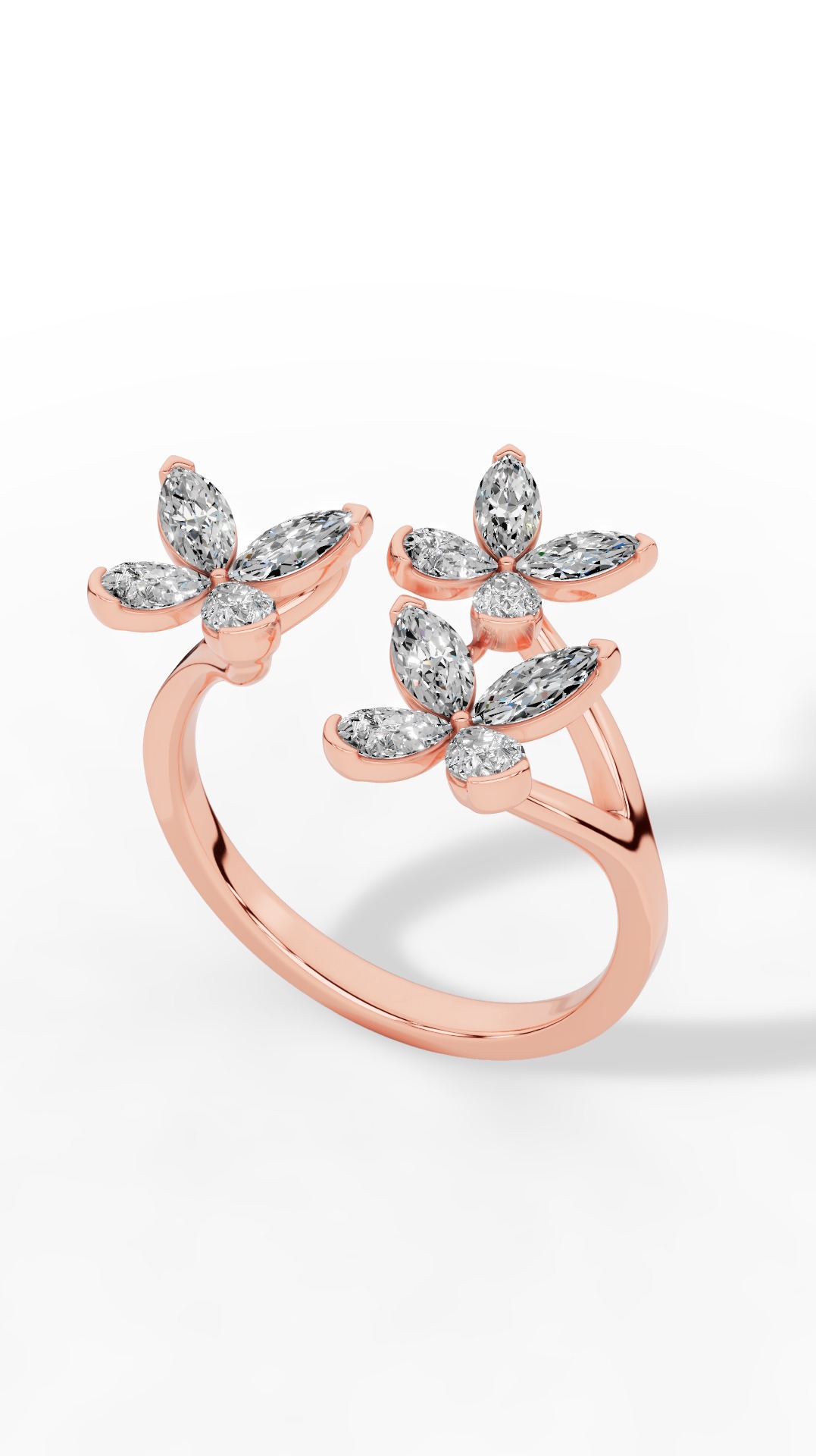 Three delicate butterfly grace the top of the band, each petal elegantly formed from sparkling marquise and round-cut gemstones for an enchanting, nature-inspired look. The open bypass design adds a modern twist, making this ring perfect for stacking or wearing solo as a statement piece.The gems offer timeless brilliance and exceptional fire, so you can enjoy luxury with a clear conscience. Ideal for gifting or treating yourself, this versatile design complements both everyday outfits and special occasions, adding a whimsical flourish and irresistible sparkle to your jewelry collection. Crafted in 14K rose gold, the design achieves everyday sophistication with a metal that stands up to a dynamic lifestyle.