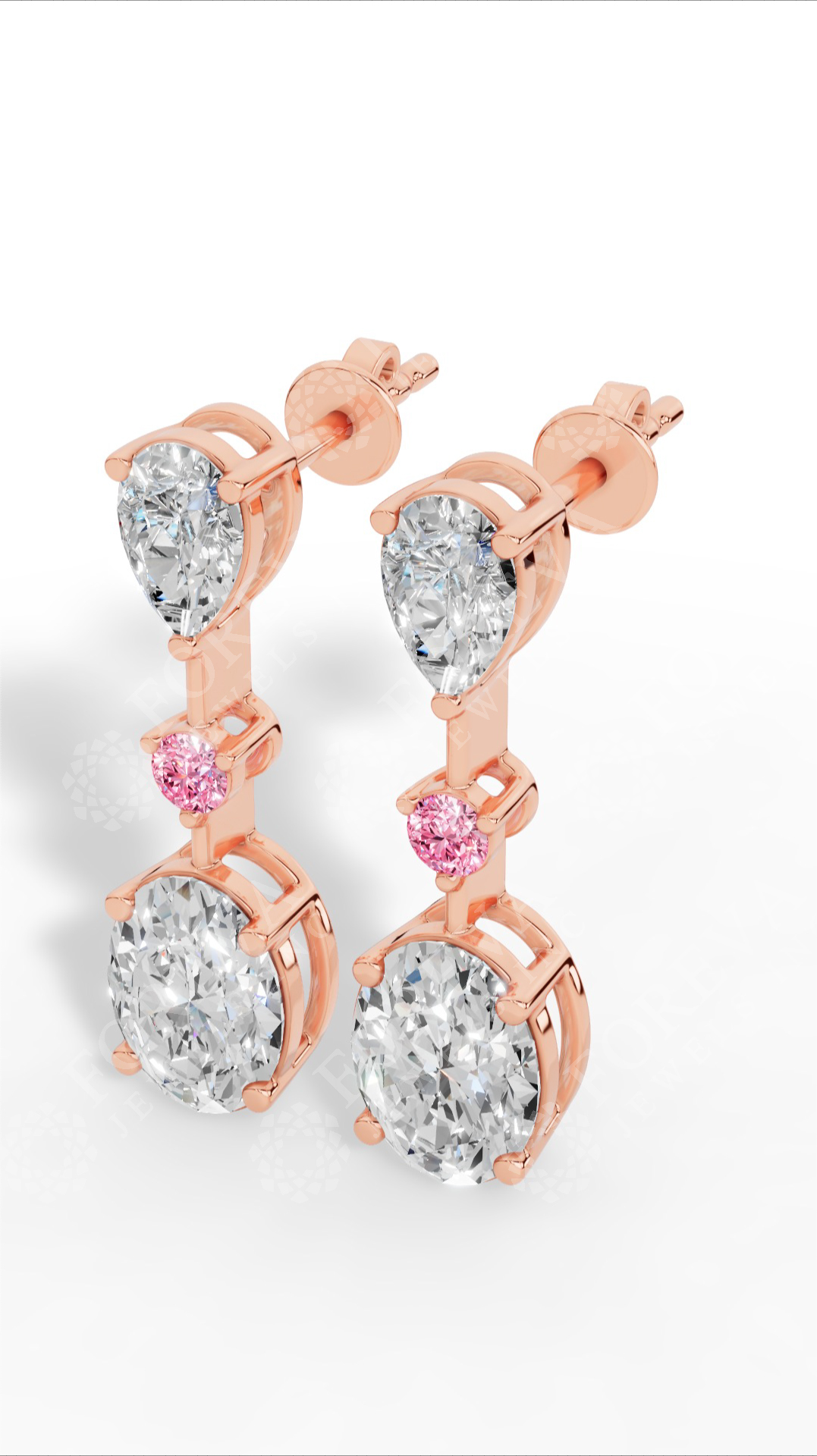 Double Charm Drop Earrings With Combination Of Pear, Pink Round & Oval Cut Lab Grown Diamonds 18K Rose Gold 2.8 CTW