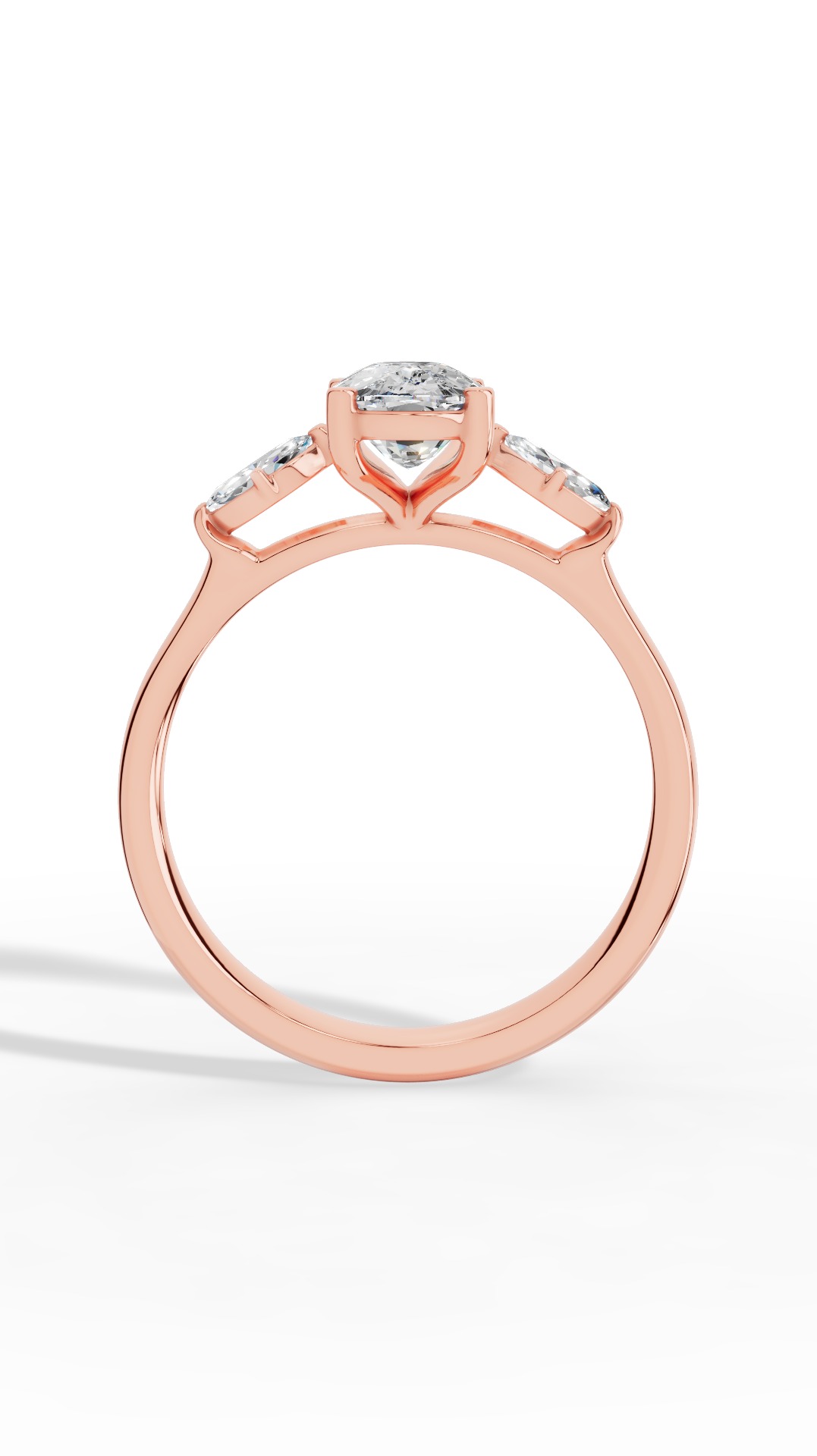The elongated three-stone ring features a dazzling solitaire marquise cut gem accompanied by oval cut stones set in a sleek design, radiating elegance with its sparkling, sophisticated silhouette. Crafted in 14K rose gold, the design achieves everyday sophistication with a metal that stands up to a dynamic lifestyle.