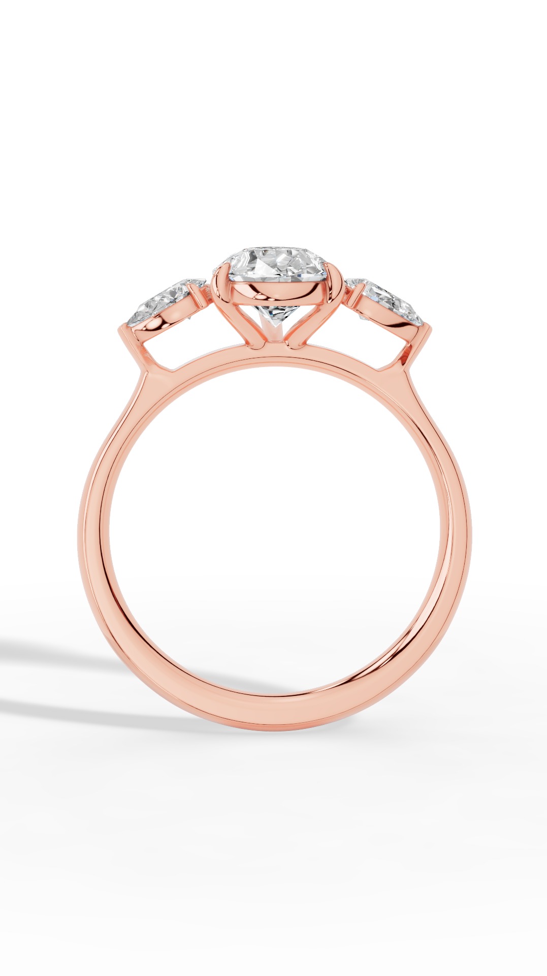 Crafted in 10K rose gold, this piece offers maximum durability without compromising its romantic character. The elongated three-stone engagement ring features a stunning pear cut center gemstone flanked by complementary stones, symbolizing timeless elegance and enduring love.