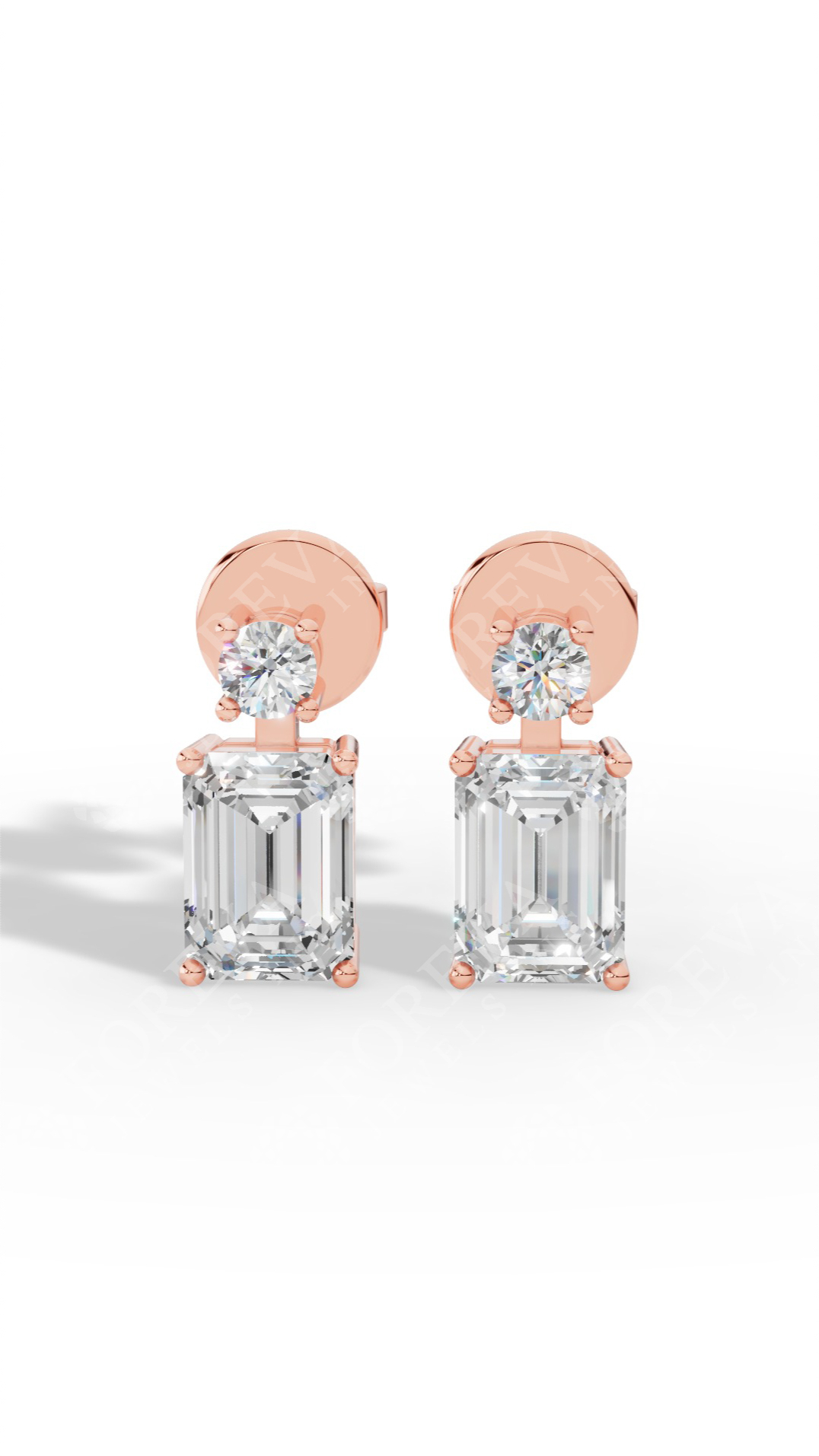 The emerald cut stud earrings feature a rectangular shape with cropped corners and step-cut facets, offering elegant, understated brilliance that highlights clarity and geometric symmetry for a sophisticated, timeless look. Luxurious 18K rose gold forms the foundation of this design, its subtle pink cast adding depth and warmth to every angle.