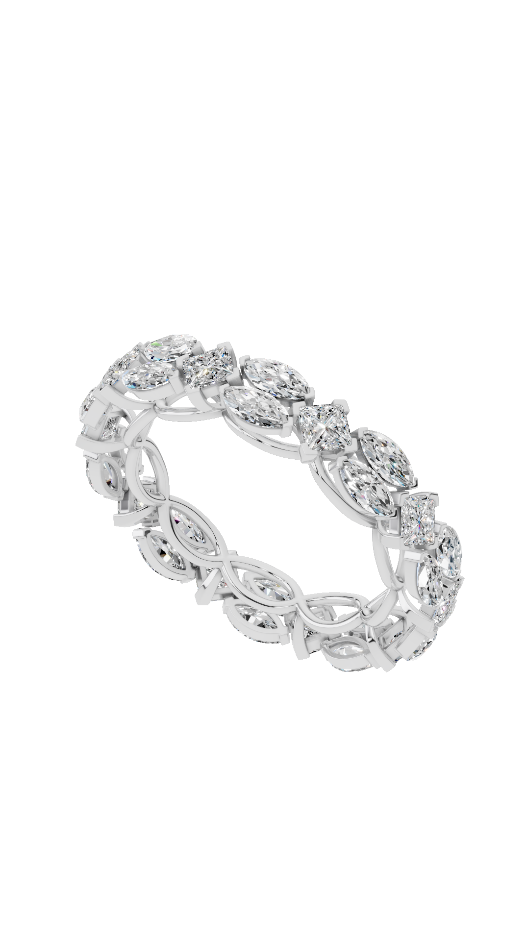 Crafted with 30 lab grown diamonds, this eternity wedding ring alternates east west marquise cuts and princess cut diamonds, each held in a V prong setting extending from the infinity style ring base to create a striking infinity flow around the band. 18K white gold delivers a platinum-like finish without compromise, its neutral tone allowing the gemstones to take center stage.