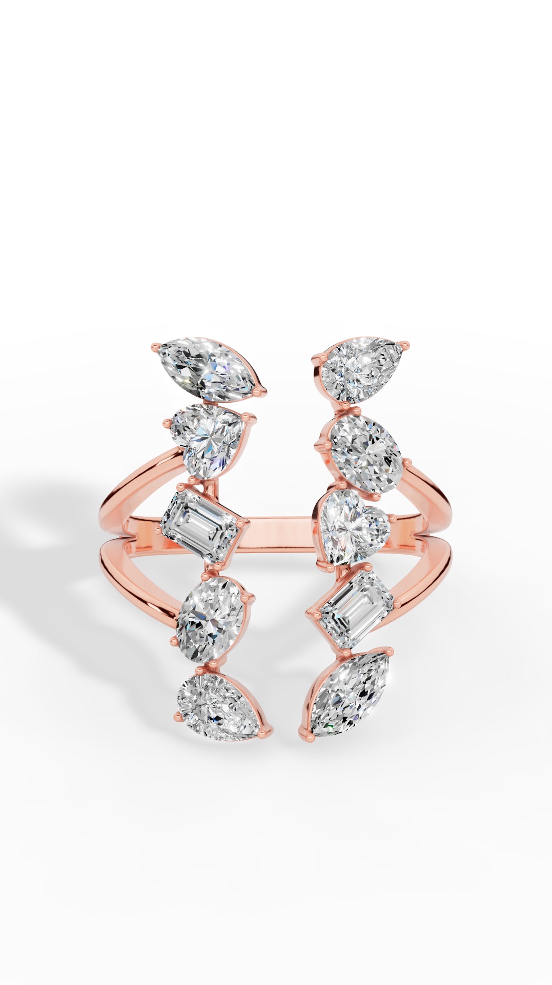 Crafted in 10K rose gold, this piece offers maximum durability without compromising its romantic character. Discover the epitome of modern elegance with this exquisite ring, meticulously crafted to capture light and attention in every moment. Featuring an artful arrangement of multiple gem shapes including the brilliance of round, the glowing heart, the sophistication of emerald, the excellence of oval and the allure of marquise and pear cuts each gem is carefully set to create a harmonious yet striking silhouette designed to make a statement.