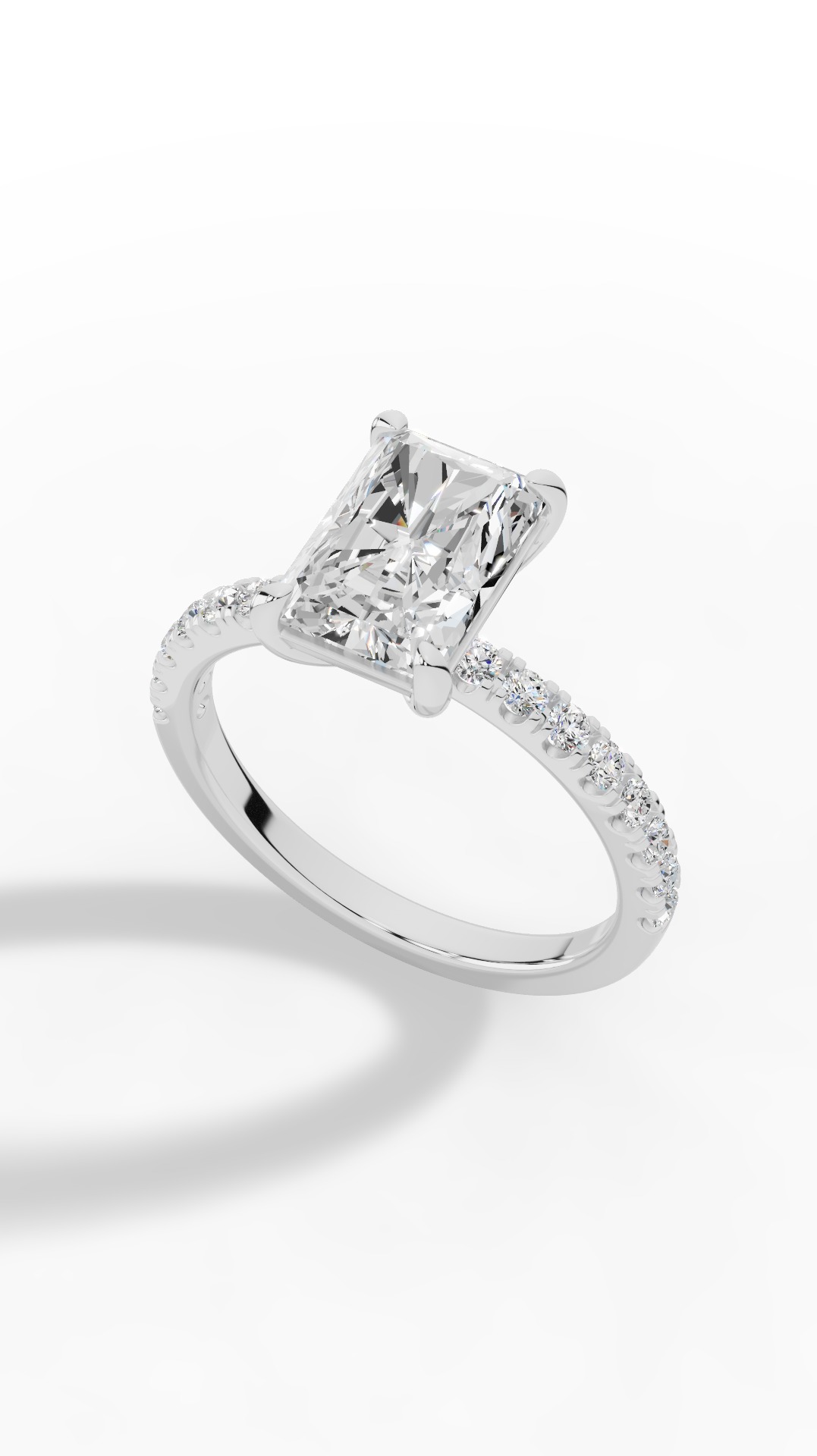 In 14K white gold, this piece balances purity with practicality. Brilliant radiant cut center framed by enchanting round cut halo ring, delivering dazzling brilliance with timeless elegance.