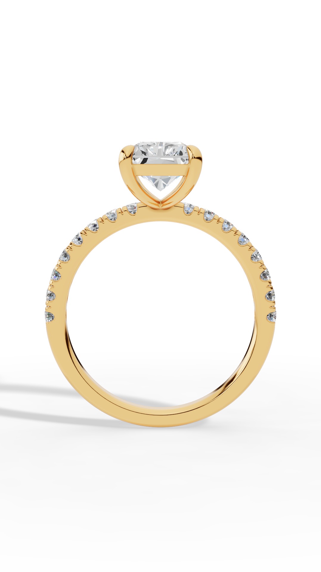 Brilliant radiant cut center framed by enchanting round cut halo ring, delivering dazzling brilliance with timeless elegance. In radiant 18K yellow gold, this piece captures the essence of luxury jewelry, blending noble metal tradition with contemporary design.