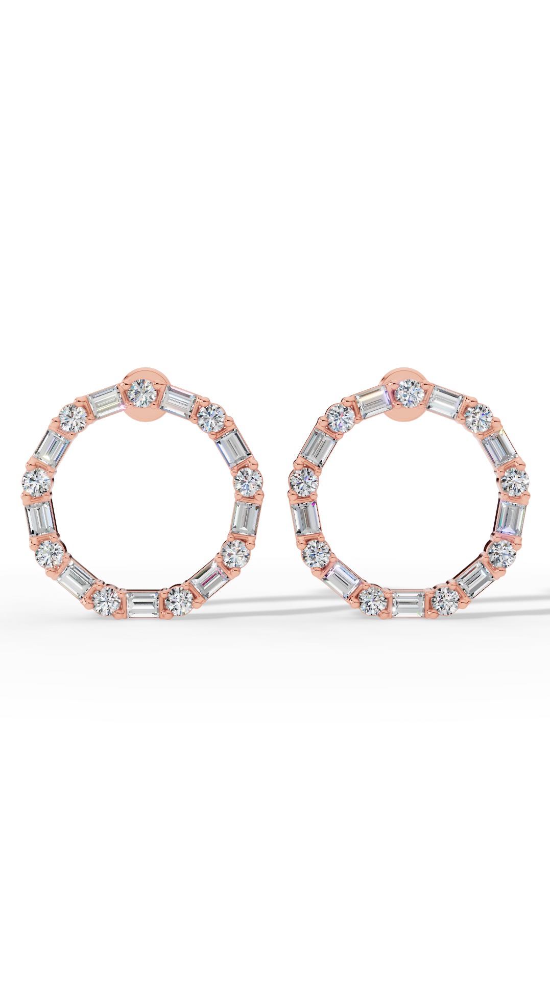 The hoop earrings feature a stunning blend of baguette and round cut, set in a sleek design that offers modern elegance and brilliant sparkle for everyday or special occasions. Luxurious 18K rose gold forms the foundation of this design, its subtle pink cast adding depth and warmth to every angle.
