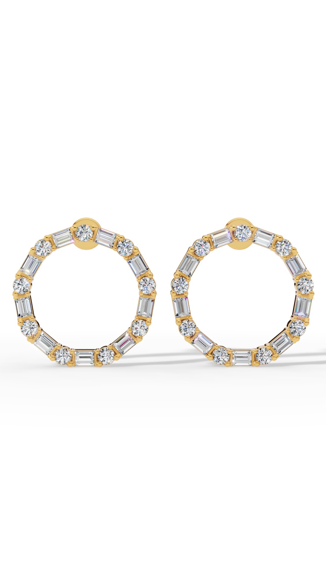 The hoop earrings feature a stunning blend of baguette and round cut, set in a sleek design that offers modern elegance and brilliant sparkle for everyday or special occasions. In radiant 18K yellow gold, this piece captures the essence of luxury jewelry, blending noble metal tradition with contemporary design.