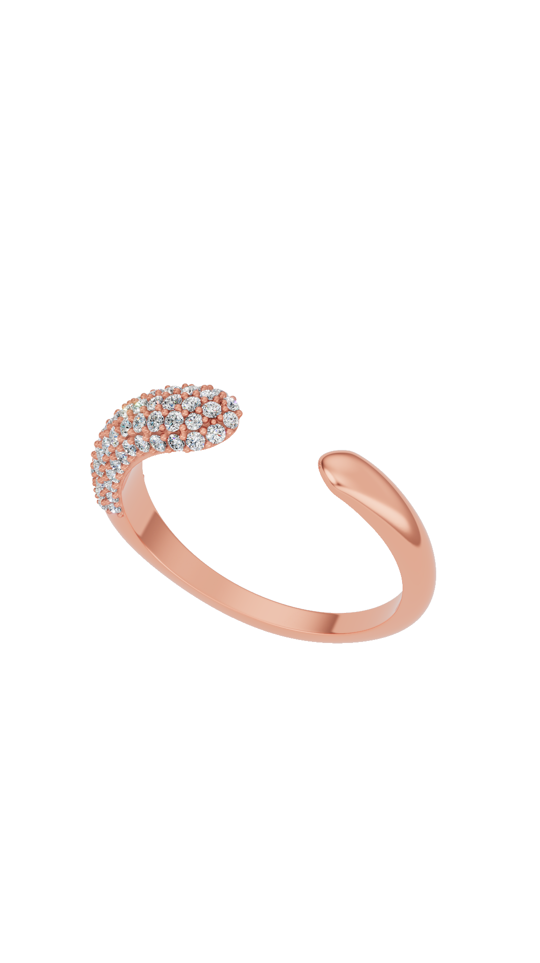 Statement open cuff ring featuring a bold pavé-set cluster of lab grown diamonds on one side, creating a striking asymmetrical design with elevated brilliance and modern luxury. The 14K rose gold composition delivers reliable luxury, combining wearability with a distinctive pink-gold radiance.