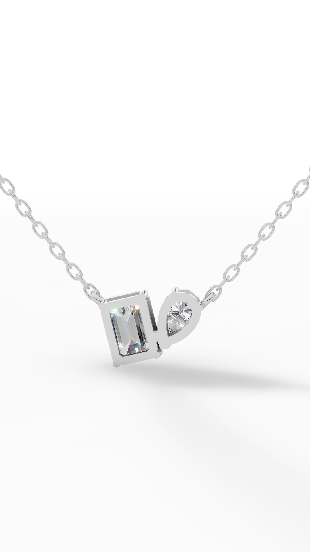 Unique Toi et Moi pendant with pear and emerald cut, symbolizing unity and contrast, elegantly suspended on a stylish chain. The 10K white gold composition balances affordability with longevity, its sturdy alloy perfect for pieces worn constantly.