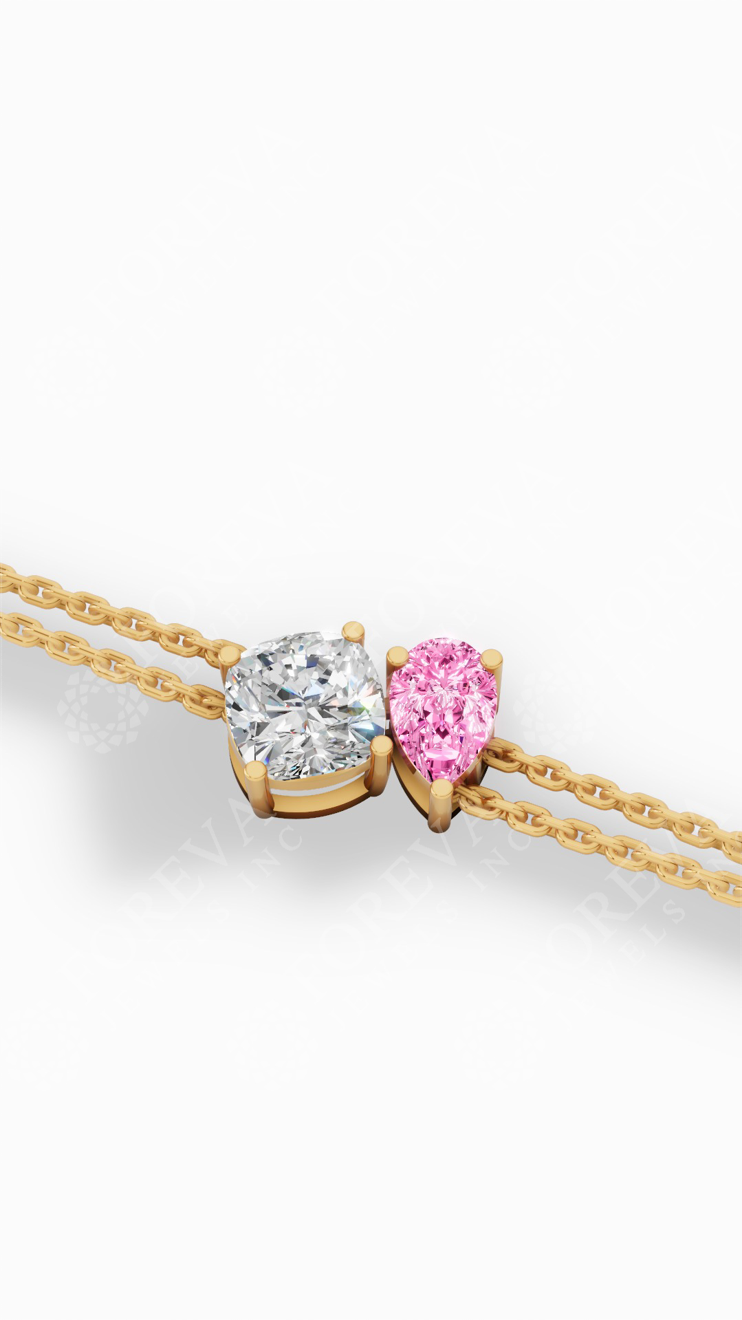 Toi Et Moi Two Tone Cushion With Pink Pear Cut Delicate Double-Strand Bracelet Lab Grown Diamonds 10K Yellow Gold 1.5 CTW
