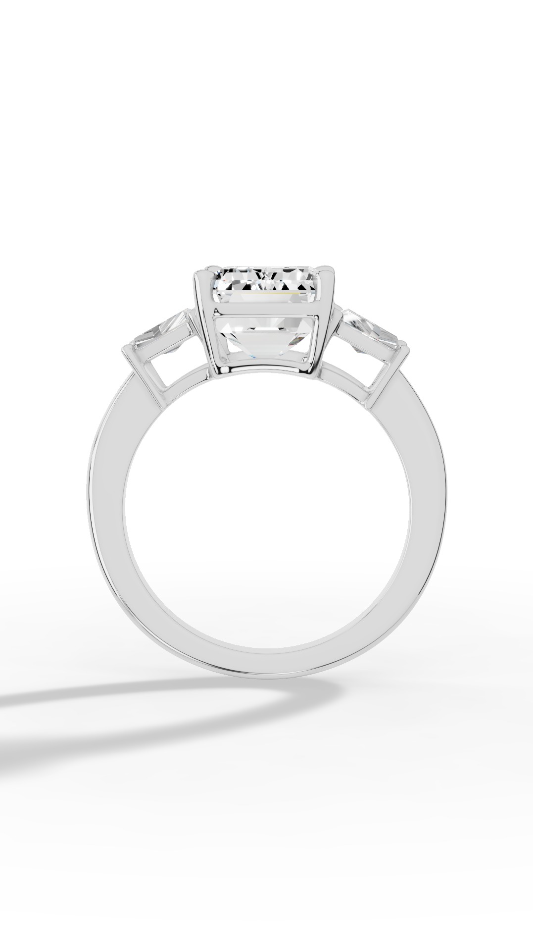 In 14K white gold, this piece balances purity with practicality. A captivating tri-stone ring featuring a centered Emerald-cut gemstone flanked by two elegant baguette gemstones, radiating modern grace and timeless sophistication.