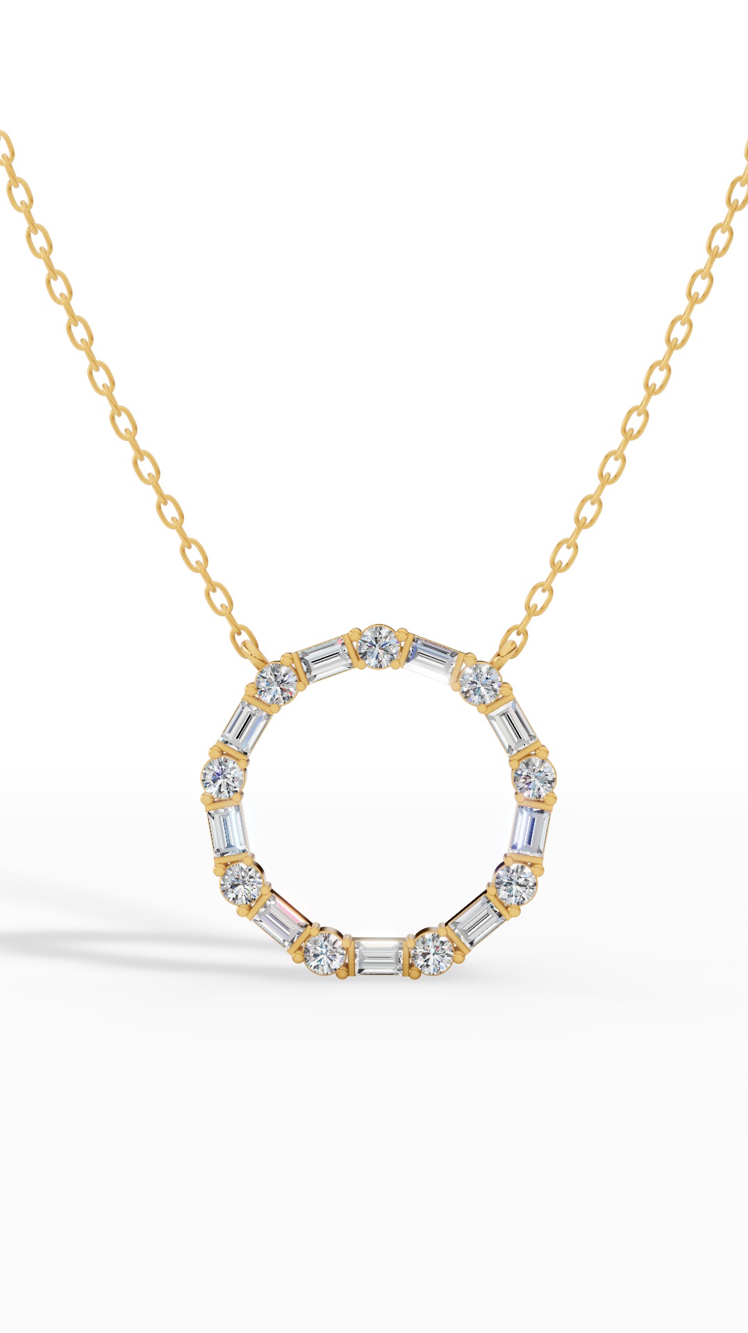 Unity Circle Necklace With Bagguete And Round Cut Lab Grown Diamonds 14K Yellow Gold 1.2 CTW